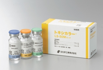 トキシカラーLS-50Mセットは、比色法によるエンドトキシン定量のための試薬セットで、Limulus polyphemusから調製したライセートと発色合成基質(Boc-Leu-Gly-Arg-pNA)を構成成分としたLAL試薬、LAL試薬溶解用の緩衝液および蒸留水(Et, β-グルカンフリー)より構成されています。